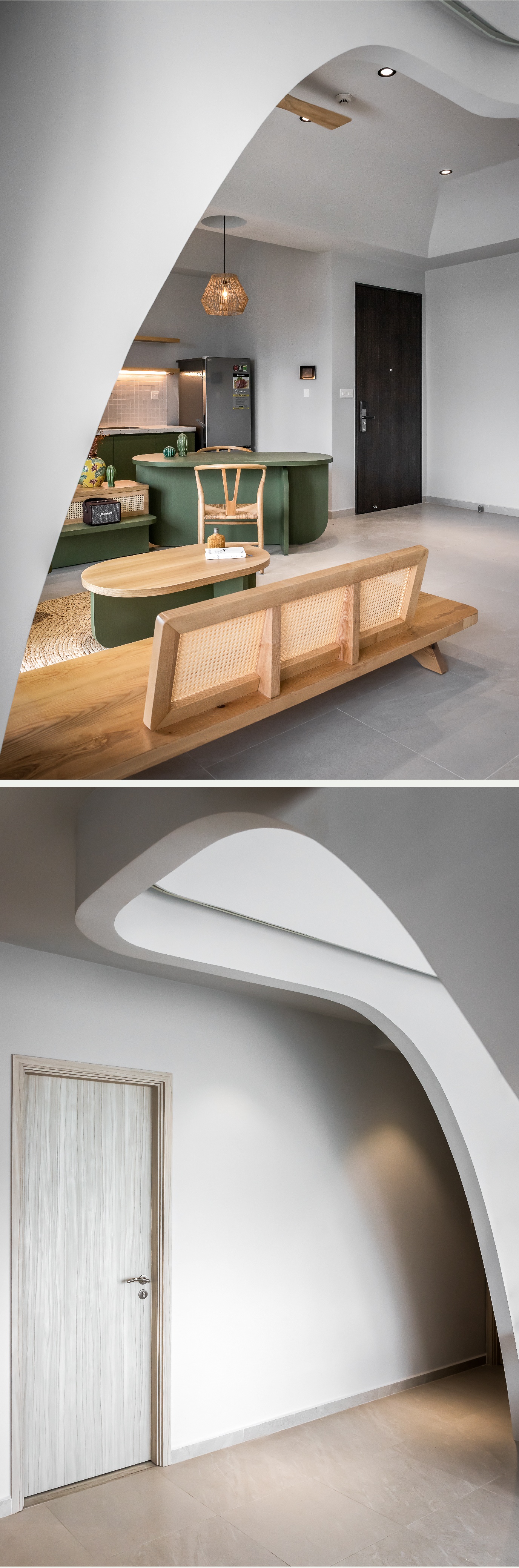 Thay vì sử dụng các hình hộp để che đường ống, kiến trúc sư đã thay thế bằng những đường cong. Không gian căn hộ sẽ trở nên mềm mại và nhẹ nhàng hơn.