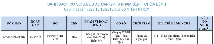 | Tên Thẩm mỹ Hàn Quốc JW trong danh sách các cơ sở thẩm mỹ được cấp phép hoạt động tại TP.HCM. |