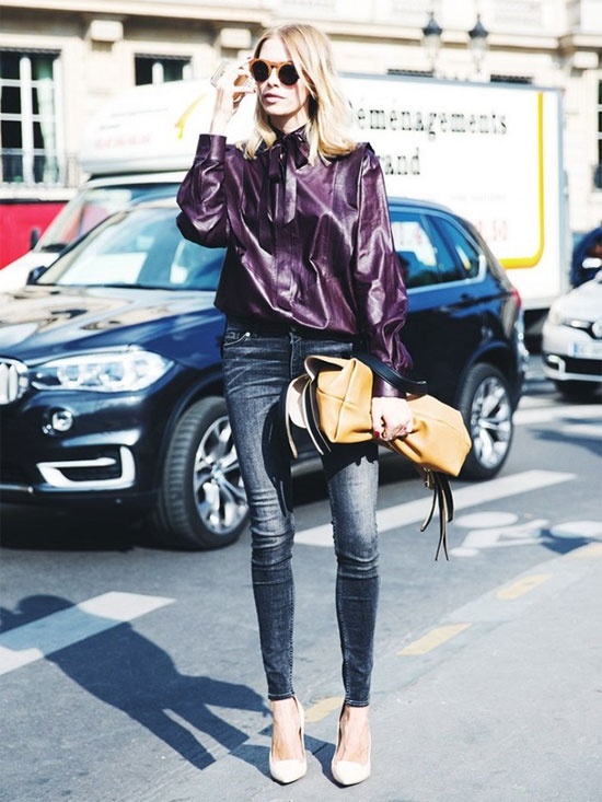 Quần skinny jeans đơn giản sẽ trở thành hot trend khi mix cùng những chiếc áo da sành điệu và quyền quý.