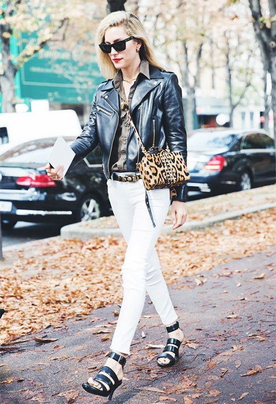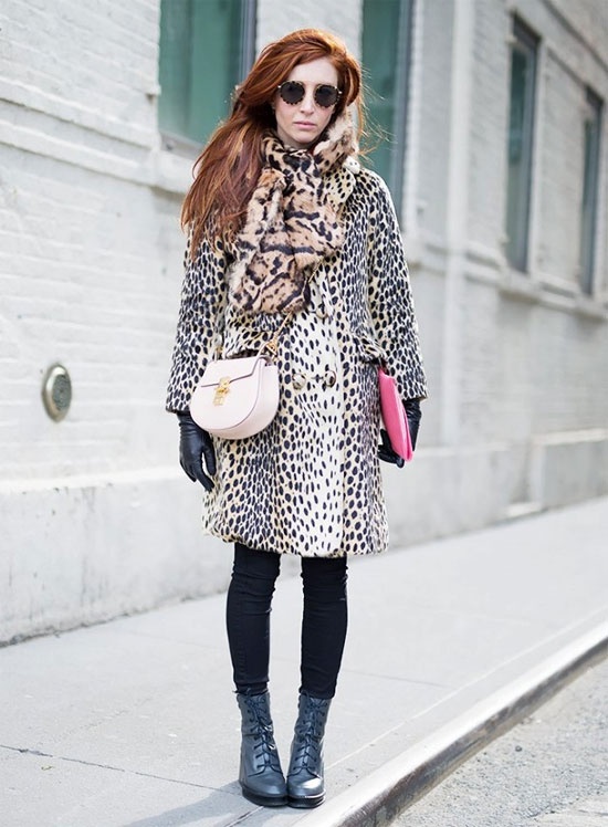 | Sự kết hợp đầy thú vị giữa áo khoác họa tiết da báo cùng quần skinny jeans. |
