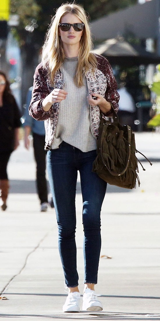 Siêu mẫu Rosie Huntington Whiteley là một trong những tín đồ của quần skinny jeans. Và đương nhiên, cách mix của cô rất linh hoạt và bắt mắt.