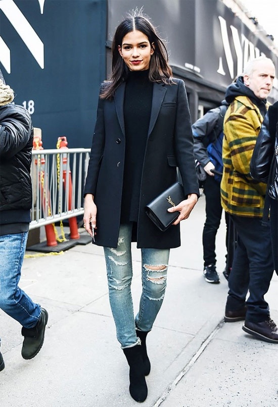 Combo kinh điển, không bao giờ lỗi mốt của skinny jeans rách gấu, áo len cao cổ, áo blazer thanh lịch.