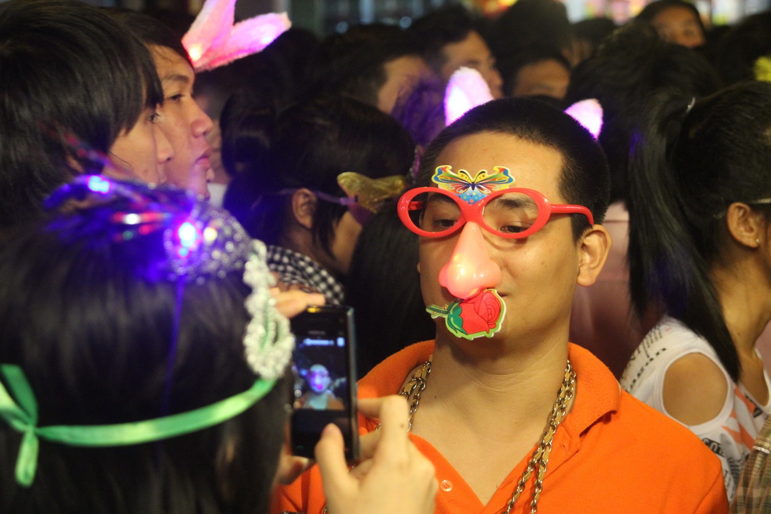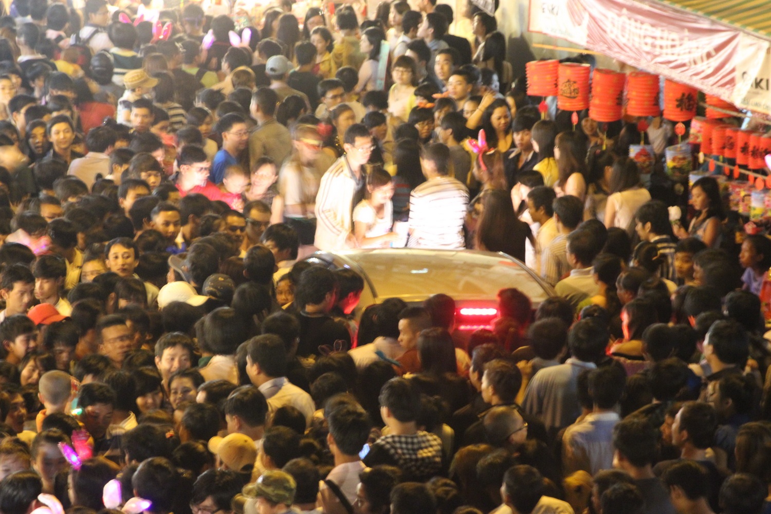 | Một chiếc ô tô chạy về nhà nhưng bị kẹt giữa hàng ngàn người. Nhiều người chỉ tập trung vượt qua chỗ "kẹt người" chứ không còn chú tâm đến các loại đèn lồng rực rỡ, đầy sắc màu nữa. |