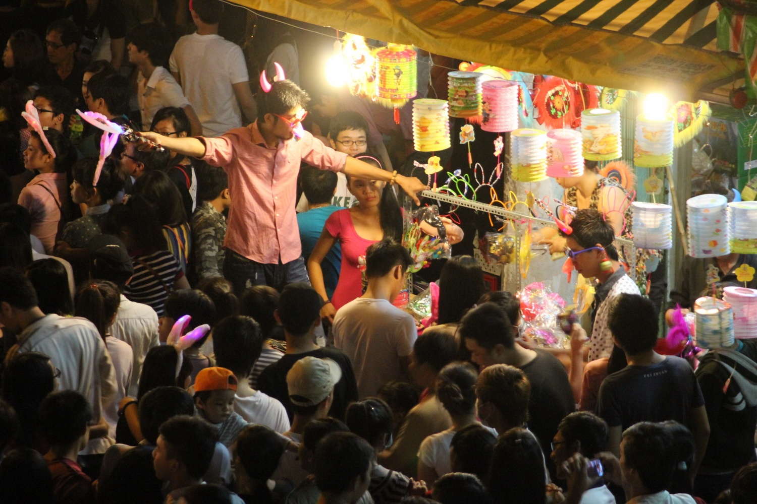 | Chen chúc xem, chụp ảnh và mua các loại đèn lồng. |