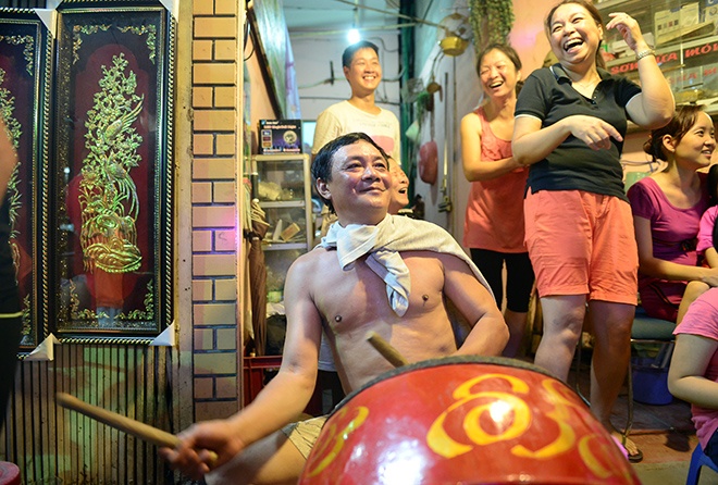 | Trung thu không thể thiếu tiếng trống rộn ngoài đình. |