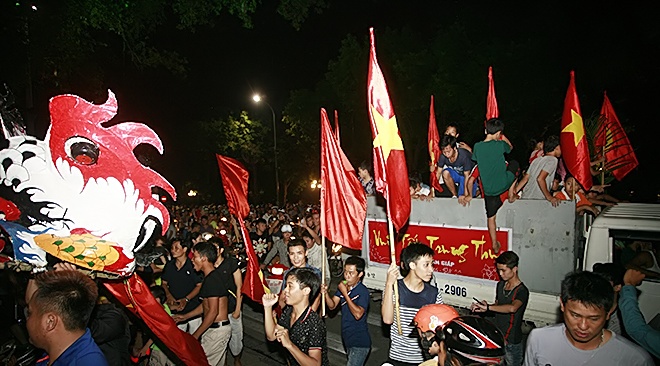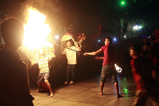 | Các bạn trẻ và những đoàn múa lân, rồng cầm cờ chạy quanh Hồ Gươm và các khu vực phố cổ. |