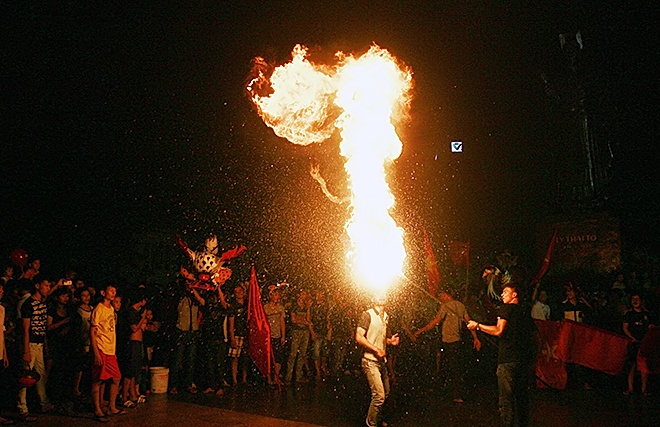| Màn thổi lửa có nhiều khán giả nhất, tuy nhiên do đứng quá gần người xem nên màn thổi lửa này khá nguy hiểm. |
