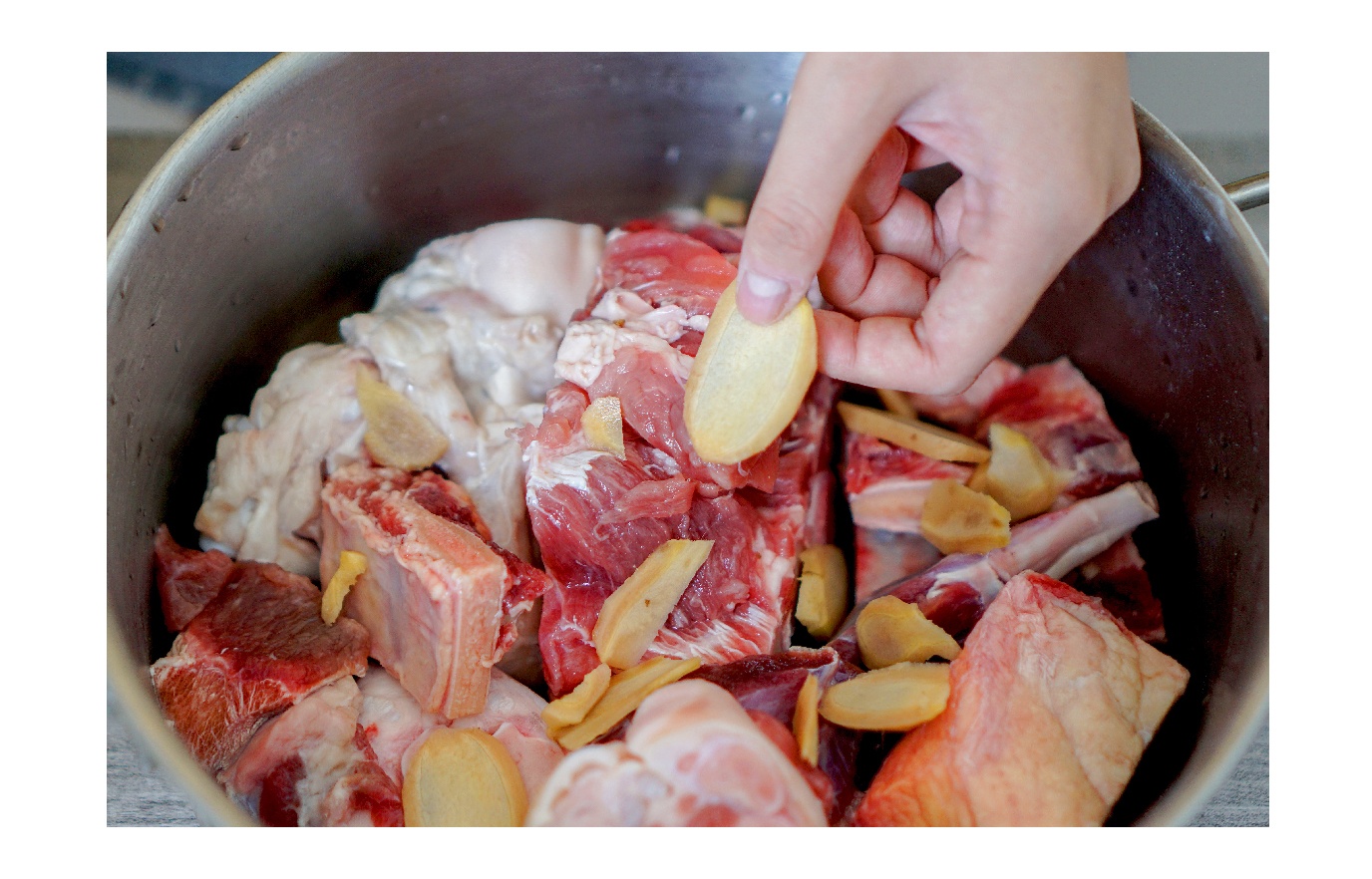 Bước 1: Rửa sạch túi xương thịt và trụng qua nước sôi với vài lát gừng trong 5 phút rồi vớt ra ngâm nước đá sạch.