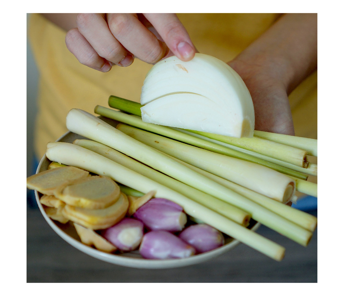 Phần gừng còn lại gọt vỏ. Theo hướng dẫn, sả, hành tây và hành tím rửa sạch, để nguyên củ. Tuy nhiên, vì muốn nước dùng đậm đà, thơm hơn, tôi dùng chày đập dập sả, hành tím.