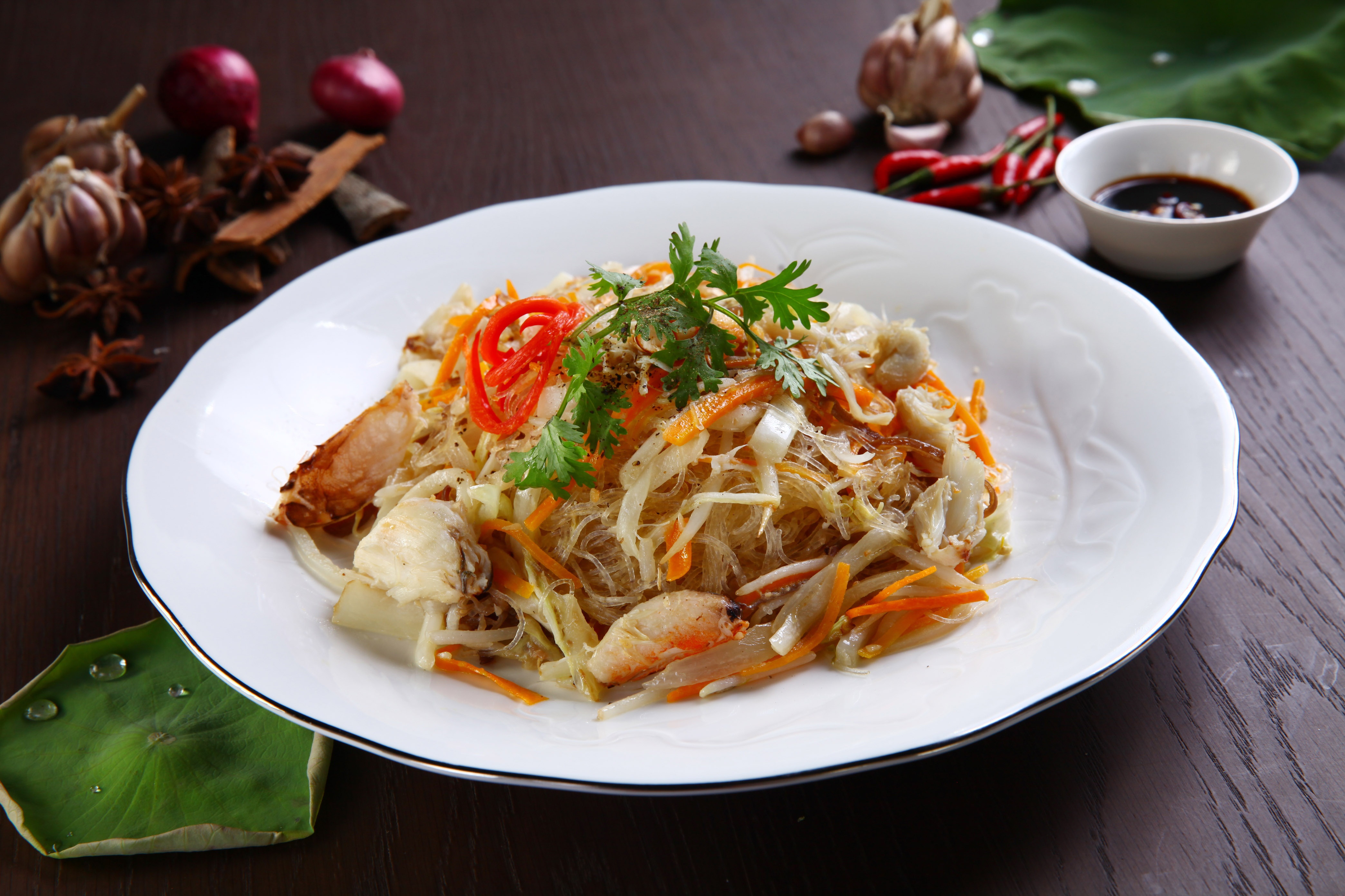 Xào các nguyên liệu trên khoảng 3 phút thì cho miến vào, xào thêm 2 phút. Nêm vừa ăn. Cho hành lá vào.