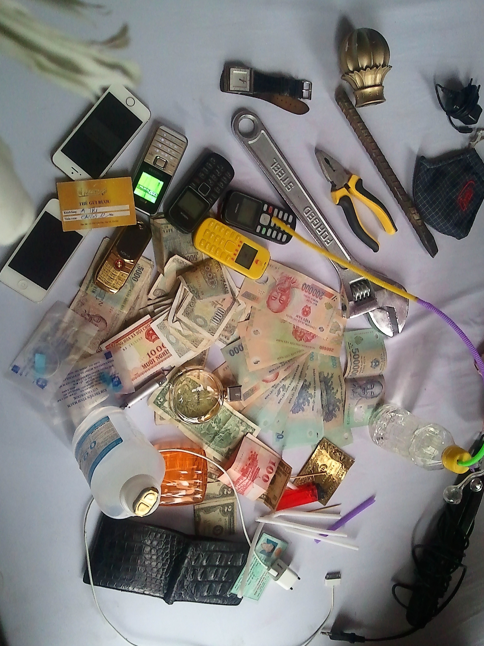 | Toàn bộ số tang vật cảnh sát thu giữ tại phòng trọ của Đức. |