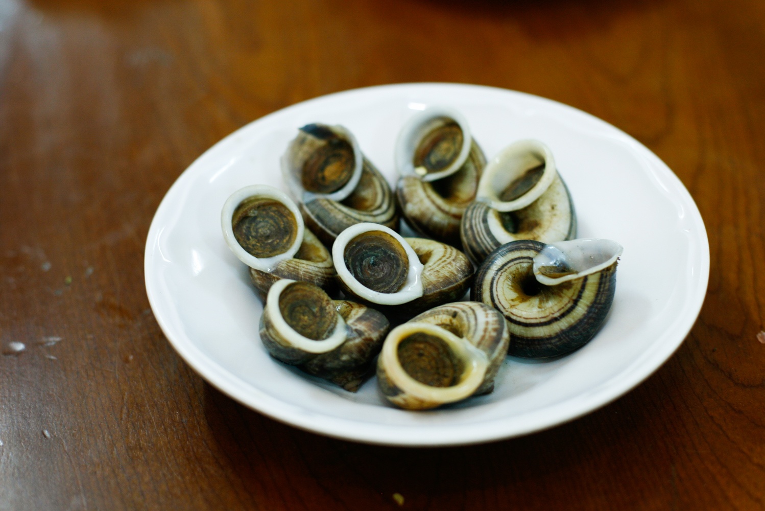 | Ốc chuối cối với phần vỏ cứng phải đập ra mới có thể chế biến. |