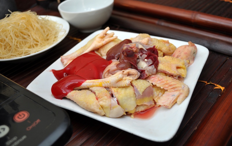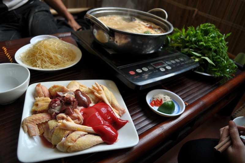 Lẩu gà ở Hà Nội nhiều nhan nhản, nhưng gà tươi, ngon đều như ở đây thì hiếm lắm. Đến quán này ăn lẩu gà bao giờ khách cũng được nhân viên yêu cầu đợi chừng 20 phút để chờ… vặt lông, cắt tiết. Đĩa gà bưng ra người sành ăn nhìn biết ngay là quán không nói dối. Vì từ khúc thịt, bộ lòng mề cho đến miếng tiết óng ả, đỏ au đều tươi rói. Gà ở đây có lẽ là loại gà non, rất bé, mỗi con chắc chỉ tầm hơn 1kg, nhỏ nhưng chất. Giống gà này thịt chắc mà mềm, gà không quá béo nên phần da cũng vừa phải, độ béo ngậy vừa tới chứ không “đáng ớn” như gà công nghiệp.