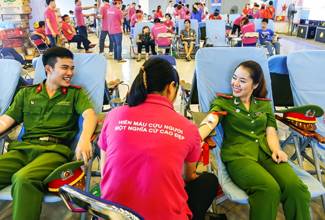 | Giải nhì "Mình vì mọi người" của Vũ Quốc Hưng ghi lại hình ảnh những chiến sĩ trẻ của Học viện Cảnh sát nhân dân hiến máu cứu người. |