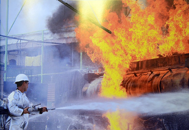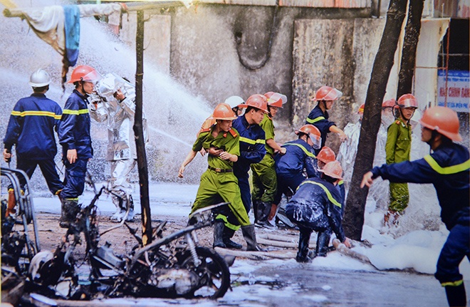 | Tác phẩm "Đối mặt với giặc lửa" của Bùi Doãn Tuấn ghi lại hình ảnh chiến sĩ cảnh sát PCCC Hà Nội làm nhiệm vụ. |