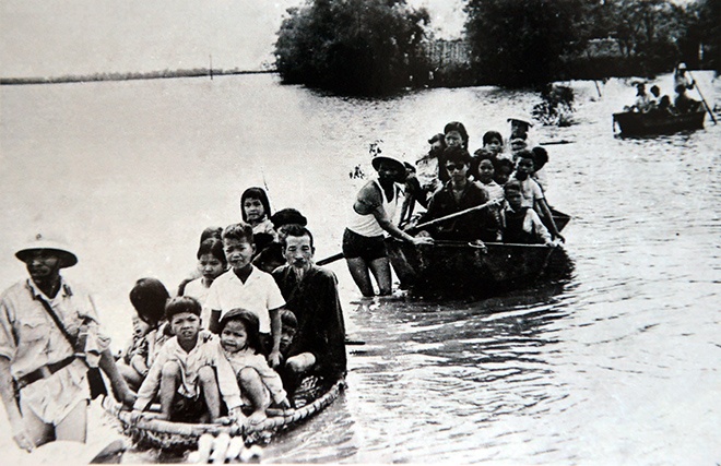 | Nhiều hình ảnh tư liệu về Công an Hà Nội các thời kỳ cũng được treo triển lãm lần này. Ảnh " Cảnh sát giao thông giúp dân qua vùng lũ năm 1971" |