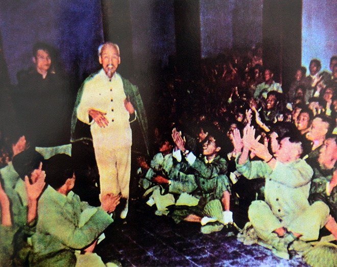 | Triển lãm khai mạc sáng 7/9/2013 tại Nhà triển lãm số 45 Tràng Tiền Hà Nội. Trong ảnh: Chủ tịch Hồ Chí Minh đến thăm cán bộ chiến sĩ Công an Hà Nội năm 1956. |