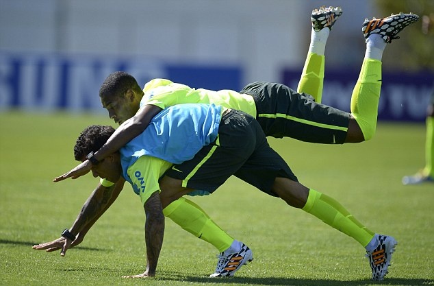 | Hậu vệ Daniel Alves tranh bóng với Fernandinho. Đây là 2 cầu thủ trụ cột trong đội hình của HLV Scolari ở World Cup 2014. |