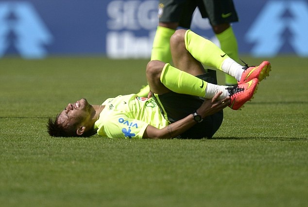 | Neymar tỏ ra khá đau sau một tình huống tranh bóng với đồng đội trên sân tập. |