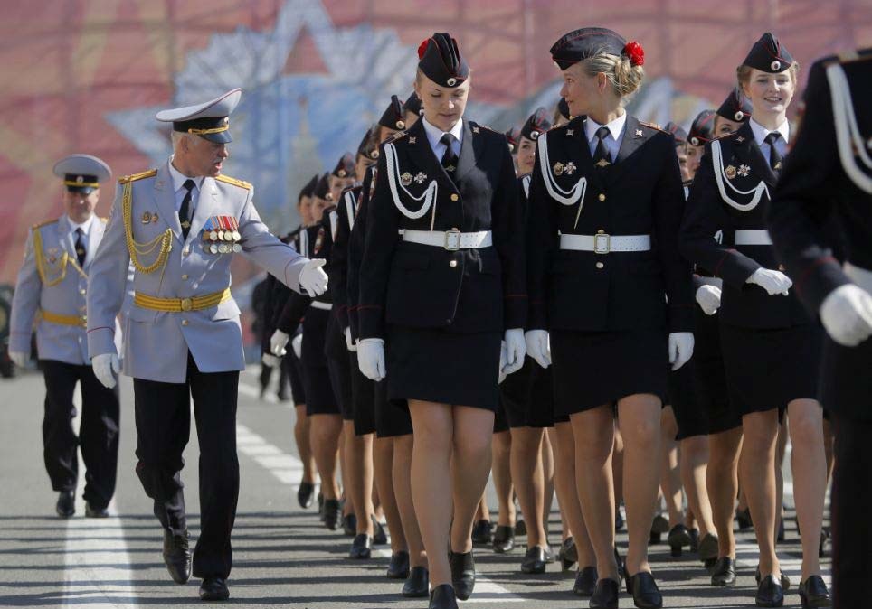 | Đội hình nữ quân nhân trong buổi diễn tập. Năm nay Nga sẽ kỷ niệm Ngày Chiến thắng với quy mô lớn nhất từ trước tới nay để nâng cao tinh thần yêu nước của người dân sau sự kiện bán đảo Crimea sáp nhập Nga. 69 chiến cơ và trực thăng sẽ xuất hiện trong Ngày Chiến thắng. Ảnh: AP |