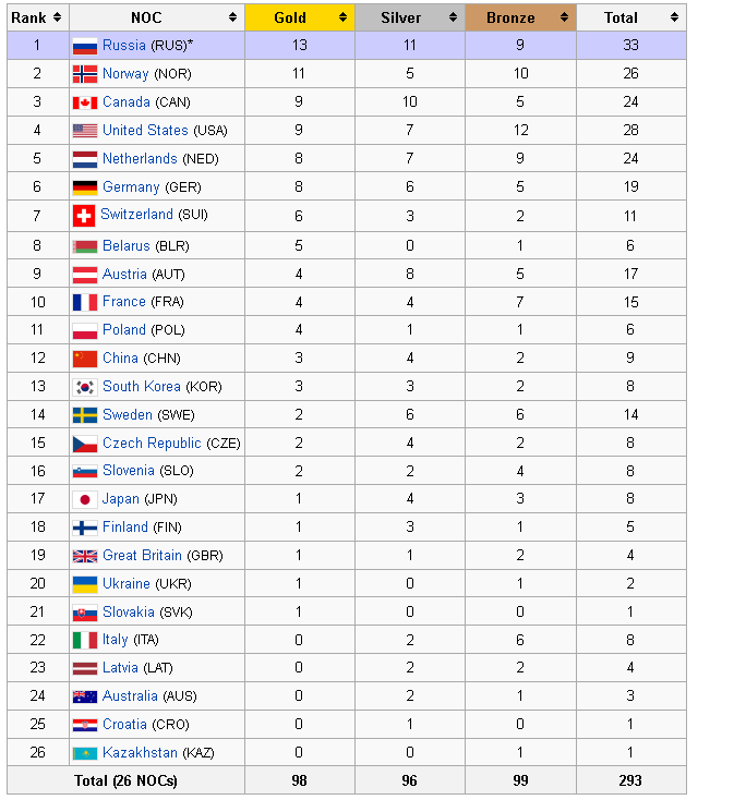 Với thành tích này, đoàn thể thao chủ nhà đã xuất sắc cán đích ở vị trí nhất toàn đoàn – hơn đối thủ cạnh tranh là ĐT Na Uy 2 HCV. Đáng tiếc, các VĐV Nga chưa thể xô đổ kỷ lục 14 HCV tại 1 kỳ Olympic mùa đông, được xác lập bởi ĐT Canada 4 năm về trước.