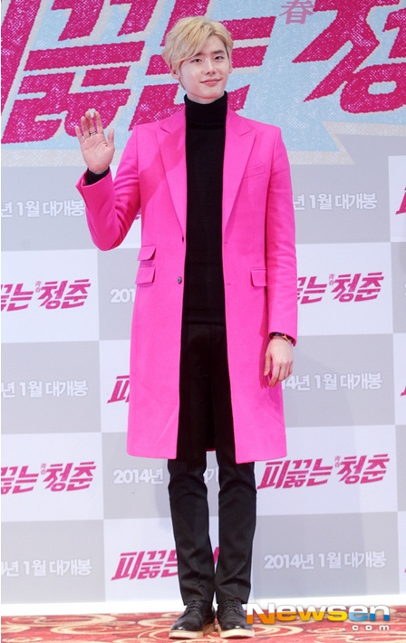 | Không chỉ có những chiếc áo tối màu, hay trung tính, Lee Jong Suk còn chọn cho mình cả một chiếc áo choàng màu hồng nổi bật. |