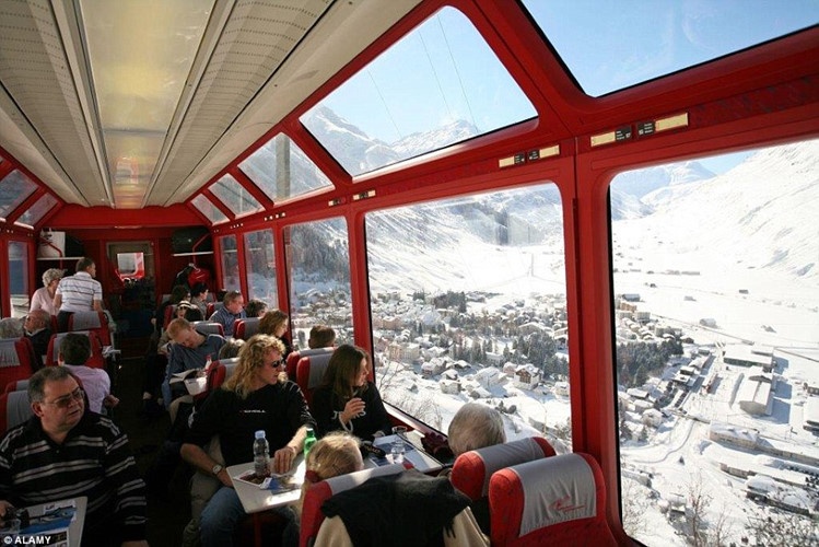 Tàu Glacier Express ở Thụy Sĩ cho phép du khách có thể thưởng ngoạn cảnh quan hùng vĩ của dãy Alps. |