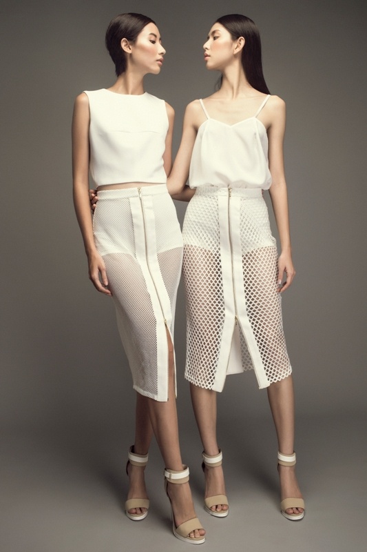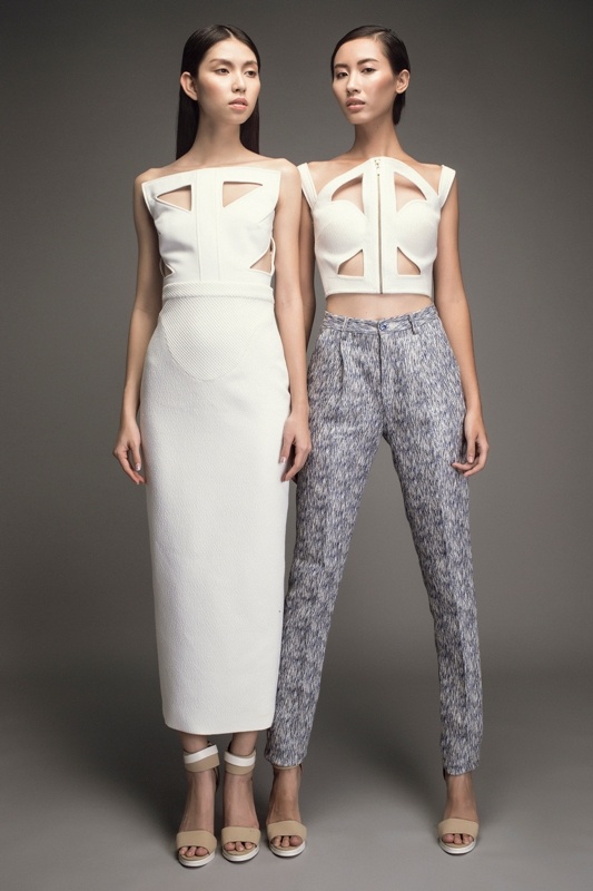 | Trong mỗi set trang phục NTK sử dụng đối đa 3 màu, các mẫu trang phục còn lại thường là màu trơn hoặc 2 tông màu kết hợp ăn ý. Trong ảnh, cặp đôi siêu gầy của làng thời trang Việt thể hiện mẫu thiết kế tối giản màu sắc để nhường chỗ cho những đường cut-out mạnh mẽ tại thân áo nổi bật. |
