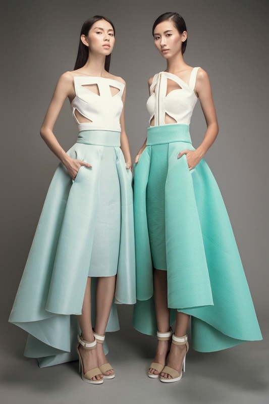 | Đầm dạ hội mullet là nét nhấn nhá của BST mang tính ứng dụng. Gam màu xanh tươi mát được dùng vào mùa đông nhưng mang lại nét trẻ trung, hiện đại và không kém phần lỗng lẫy. |