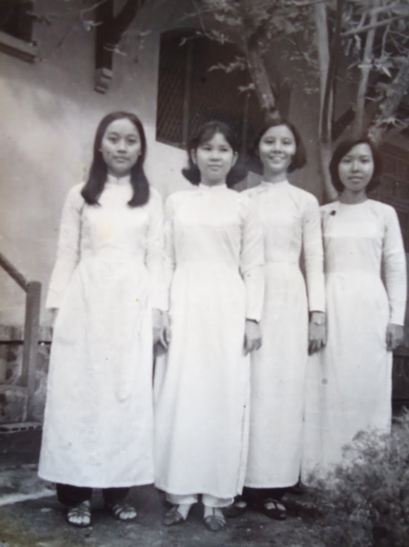 | Nữ sinh thập niên 1970 xinh xắn, hồn nhiên trong đồng phục áo dài trắng. |