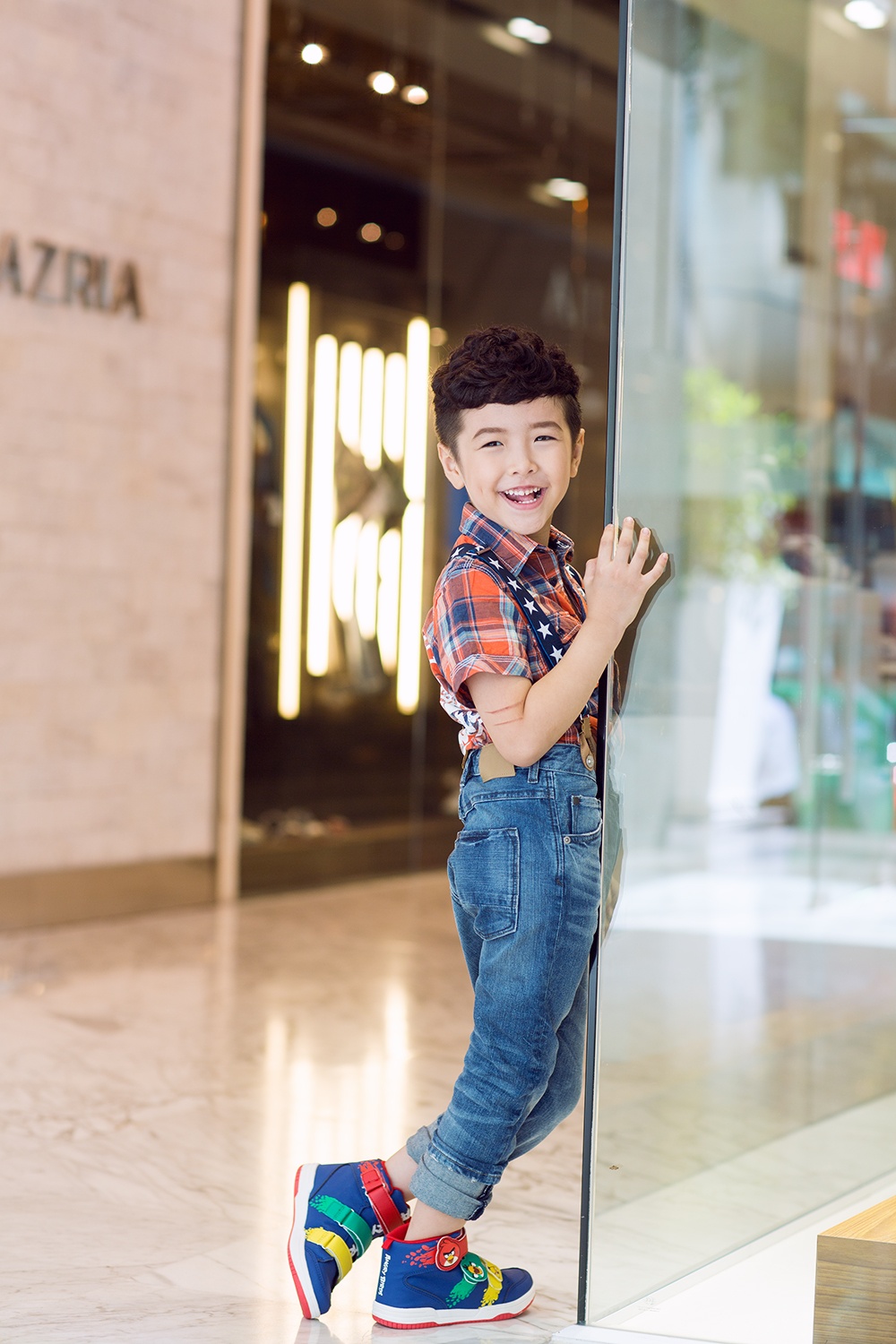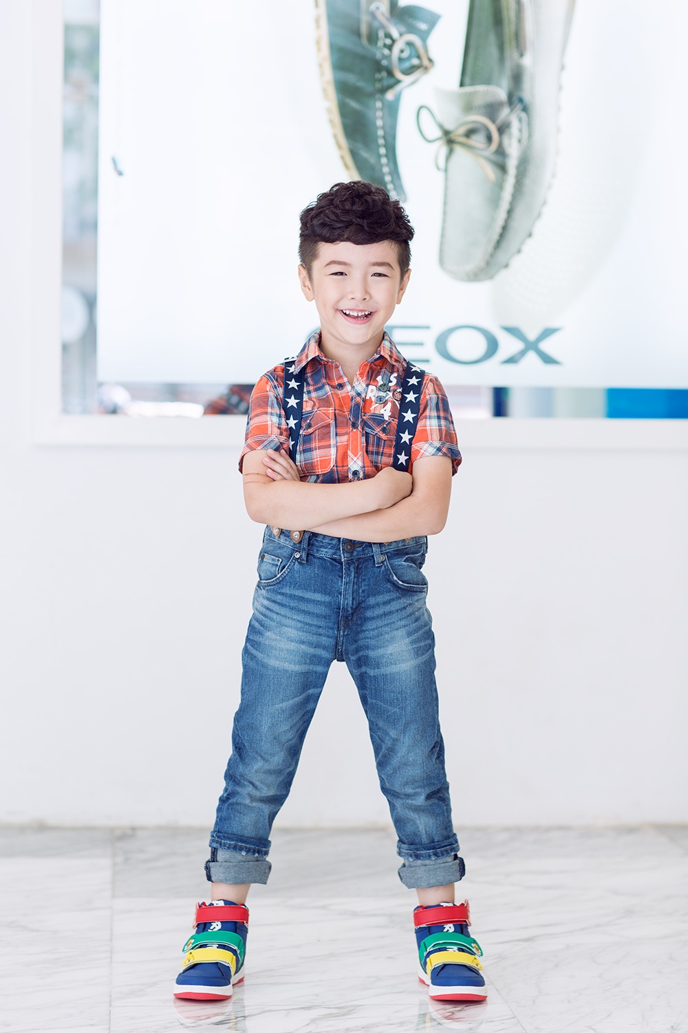 Cậu nhóc tinh nghịch trong set trang phục hiện đại, năng động. Bộ cánh kết hợp ăn ý giữa jeans thun và giày bata đồng bộ. Nụ cười rạng rỡ của nhóc tỳ giúp khung ảnh thêm sức hút.