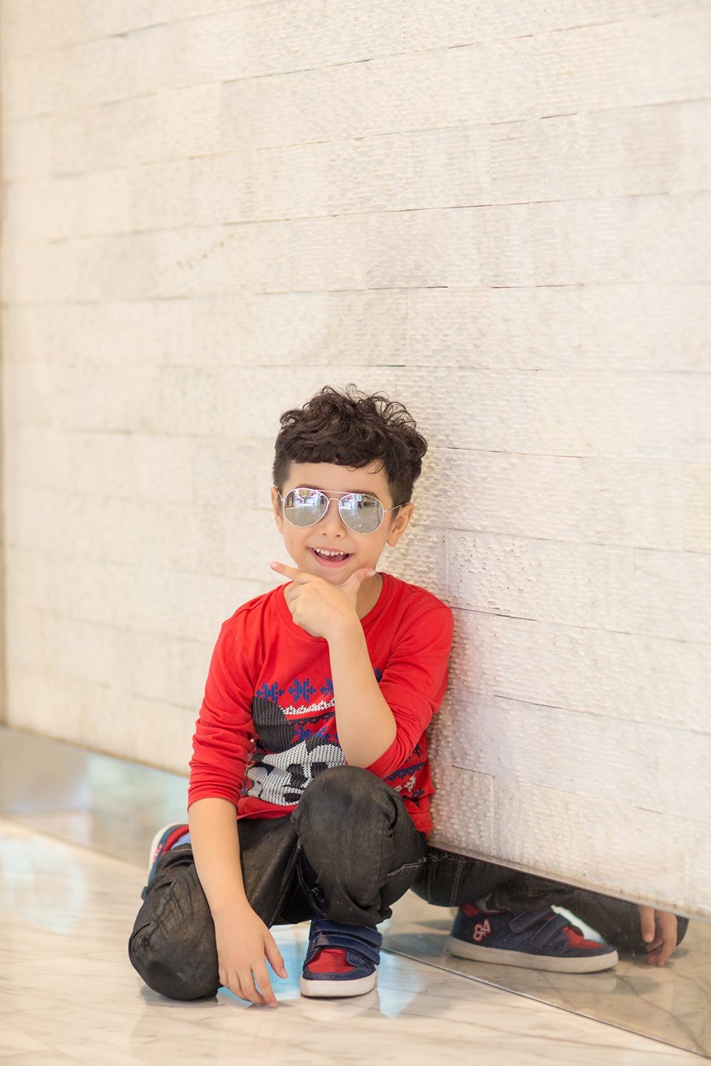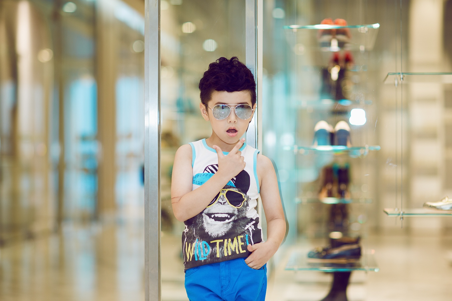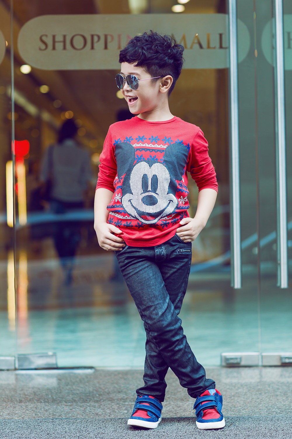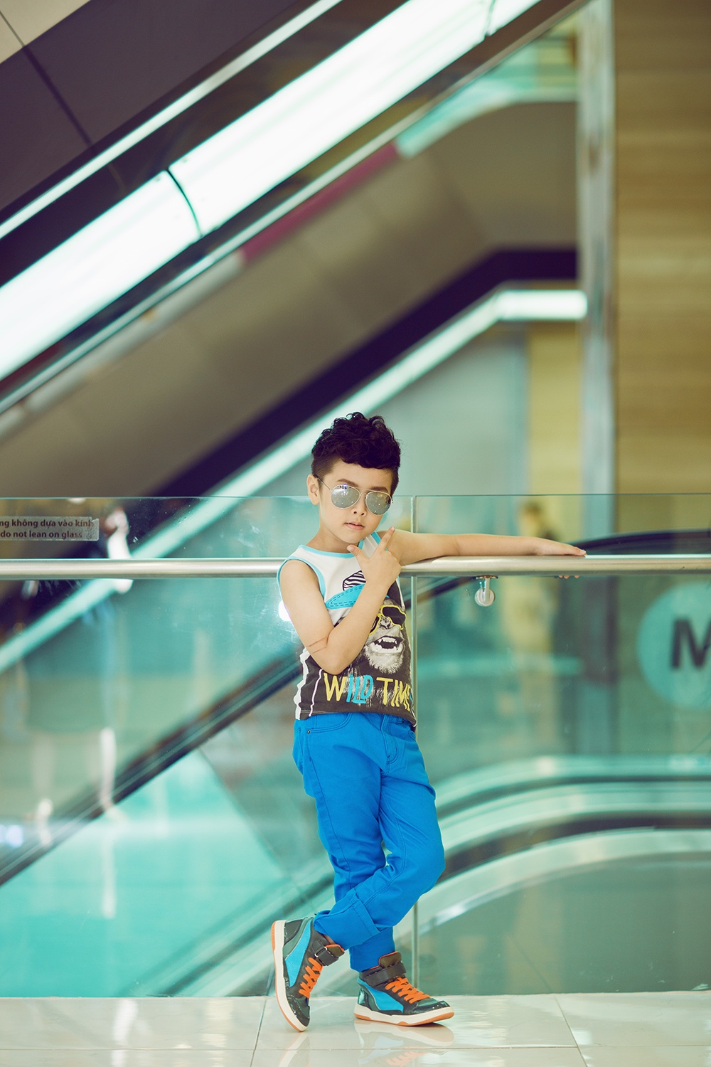 Mix cùng trang phục cá tính, Ben chọn phụ kiện giày bata tiện lợi, kính râm ánh gương sành điệu không thua kém các fashionista người lớn.