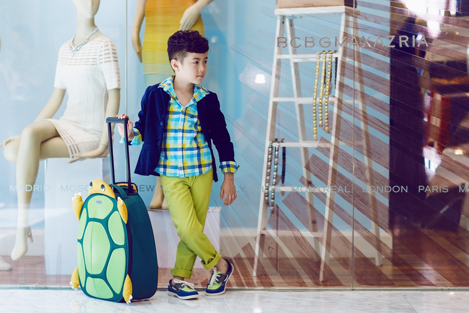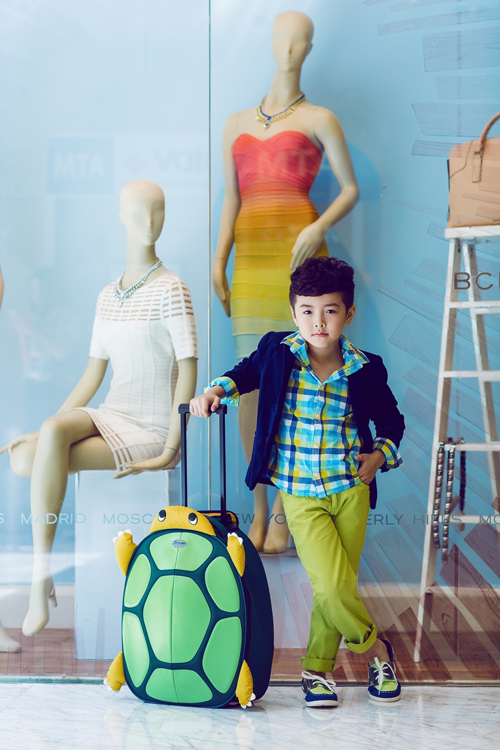 Khi đến trường, Ben diện trang phục lịch sự, trẻ trung và không kém phần đáng yêu. Cậu nhóc tỏ ra rất yêu thích gam màu xanh lá cây tươi trẻ, mix cùng áo ca-rô đồng màu và vest bên ngoài thanh lịch. Vali hình chú rùa luôn được cậu nhóc mang theo mình khi "chạy show" diễn thời trang.