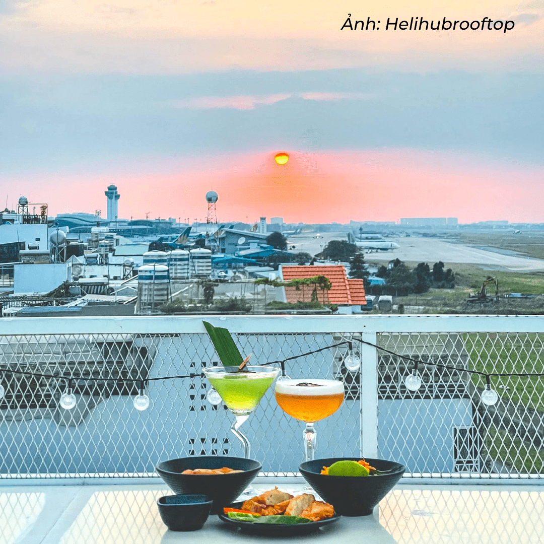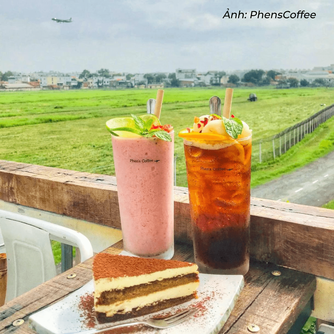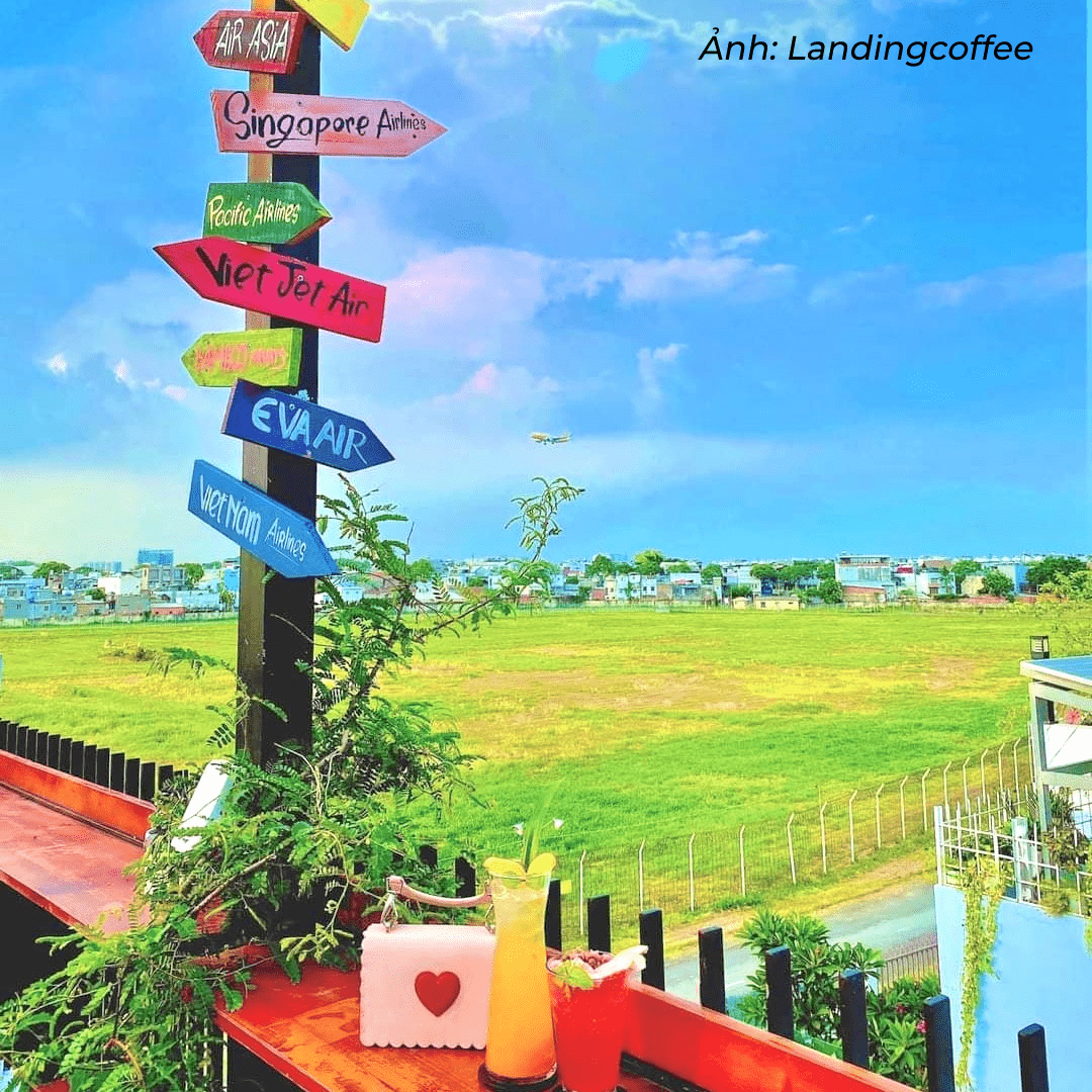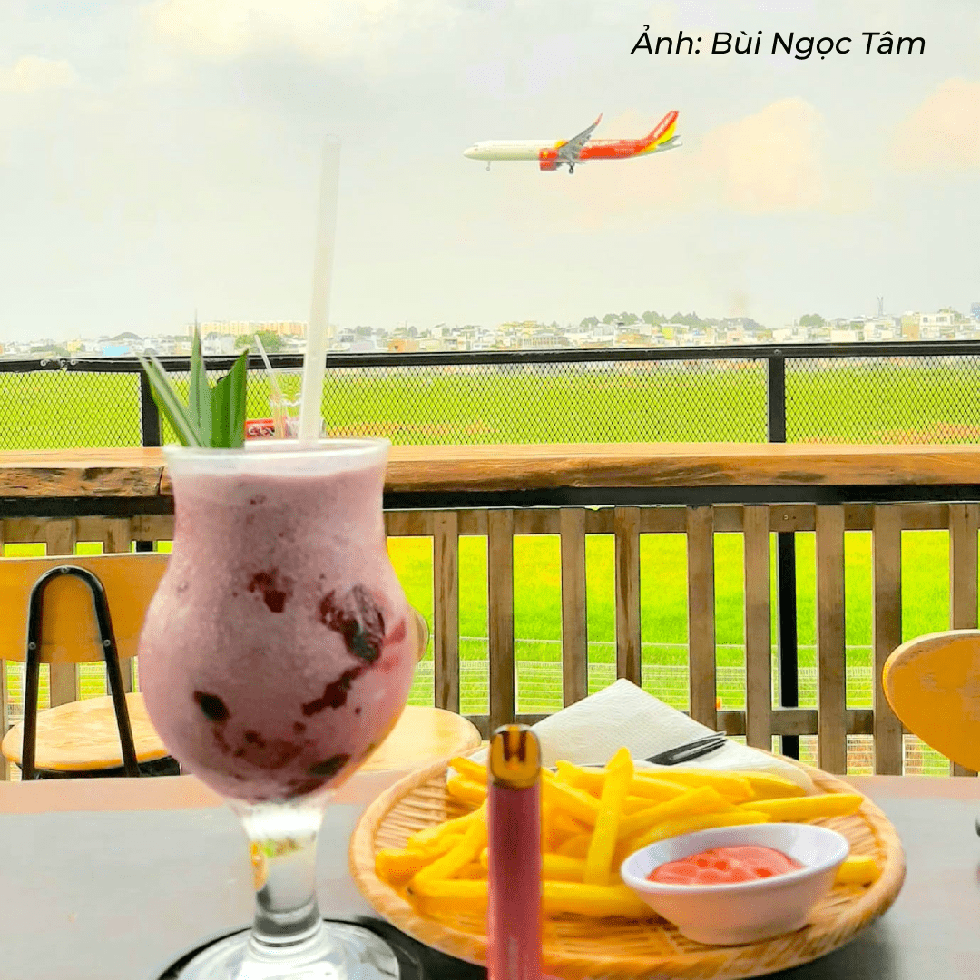 Quán cà phê nằm ở tầng 5 với view bao trọn đường băng sân bay. Không gian lộng gió, phù hợp để nhóm bạn ngồi trò chuyện và ngắm máy bay xuyên qua vạt nắng chiều hoàng hôn. Tiệm sở hữu khu tầng mái và nhiều góc chụp hình với máy bay cuốn hút khách.