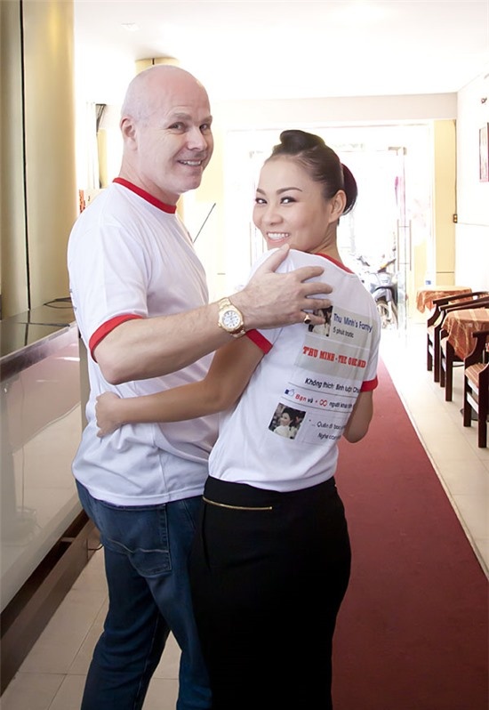 | Chồng Tây của Thu Minh là một quý ông khá thành đạt và chững chạc, tuy nhiên, có lúc anh thoát ra khỏi những bộ vest cứng nhắc để cùng vợ diện áo phông cực đơn giản. |