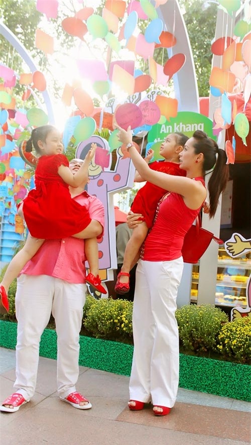 | Cặp đôi diện tông màu trắng nền nã trong khi hai nhóc tỳ lại diện tông đỏ nổi bật. |