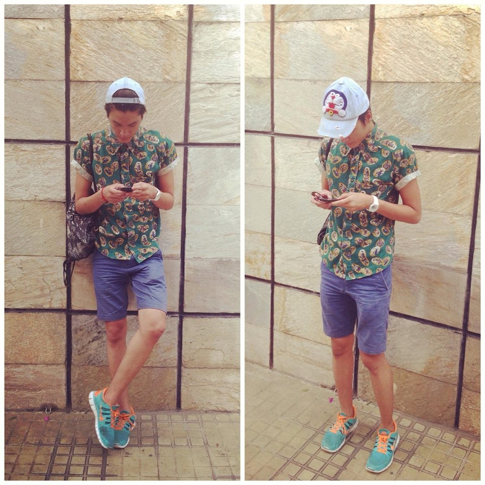 Short ngắn được phối ngẫu hứng cùng áo sơ-mi họa tiết, mũ họa tiết Doremon nghịch ngợm