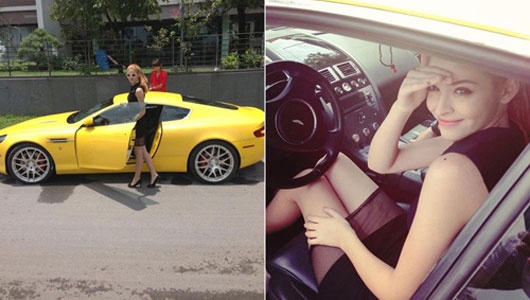 | Andrea bên chiếc Aston Martin DB9 màu vàng. |