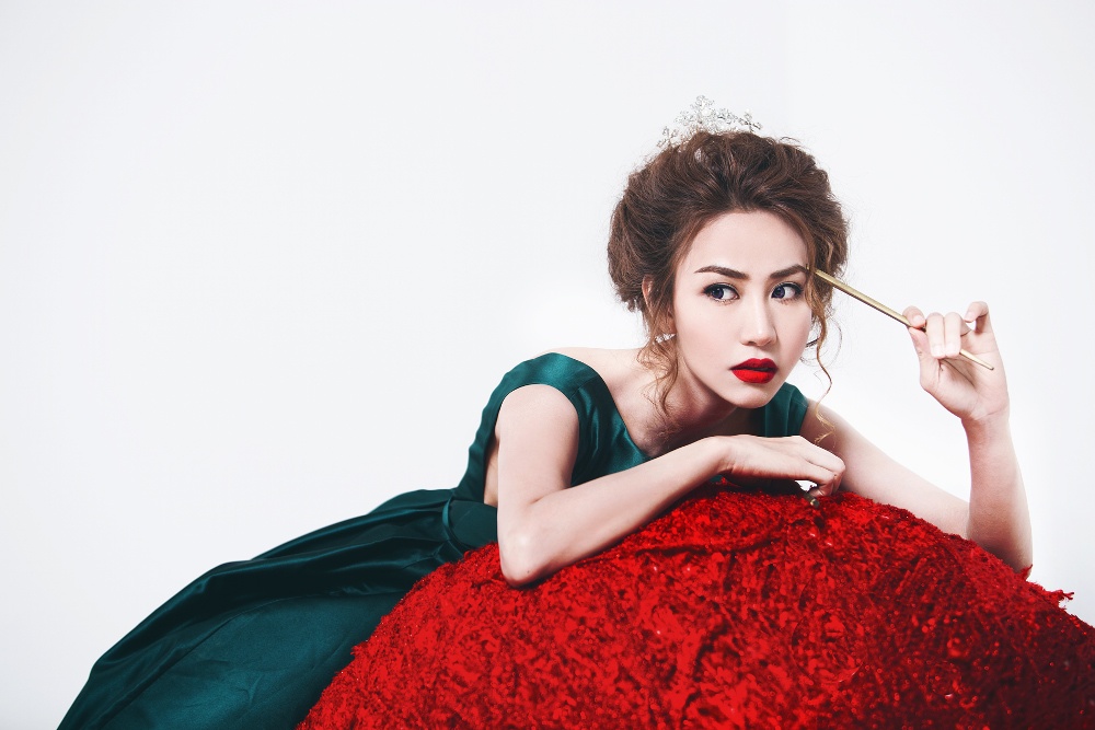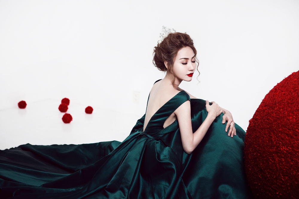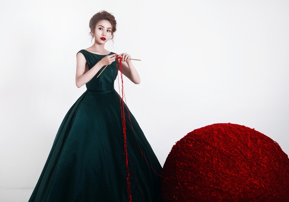 | Ngân Khánh vừa thực hiện bộ ảnh với ý tưởng mới lạ. Người đẹp diện váy sexy, thay đổi trạng thái cảm xúc đa dạng khi nằm trên cuộn len khổng lồ màu đỏ. |