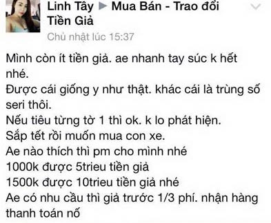Một Facebook khác có tên Linh Tây cũng mời chào: “Mình còn ít tiền giả, anh em nhanh tay nhé. Được cái giống như thật, khác là trùng số sêri thôi, nếu tiêu từng tờ một thì không lo phát hiện. Anh em nào thích thì liên hệ mình nhé, 1 triệu tiền thật đổi được 5 triệu tiền giả, đặt cọc trước 1/3”.