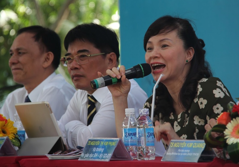 TS Nguyễn Thị Kim Phụng, Quyền Vụ trưởng Vụ giáo dục ĐH – Bộ GD&ĐT giải đáp thắc mắc cho học sinh tại ngày hội tư vấn tuyển sinh . Ảnh: Hoàng Bình. |