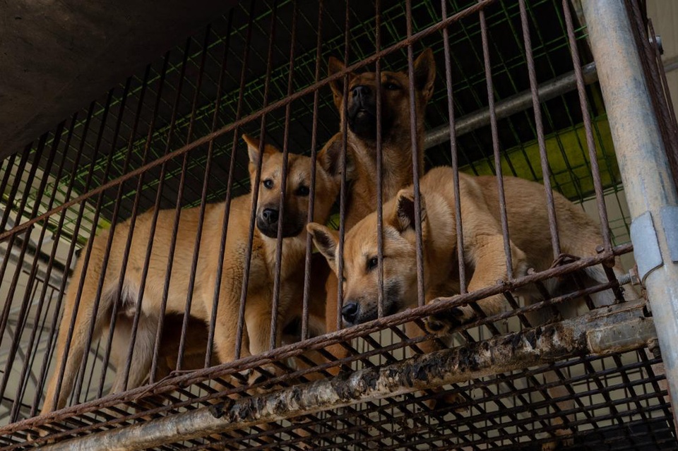 Những con chó bị nhốt trong lồng tại một trang trại nuôi chó lấy thịt ở Cheongju, tỉnh Bắc Chungcheong, Hàn Quốc, ngày 8/5. Ảnh: Korea Times. |