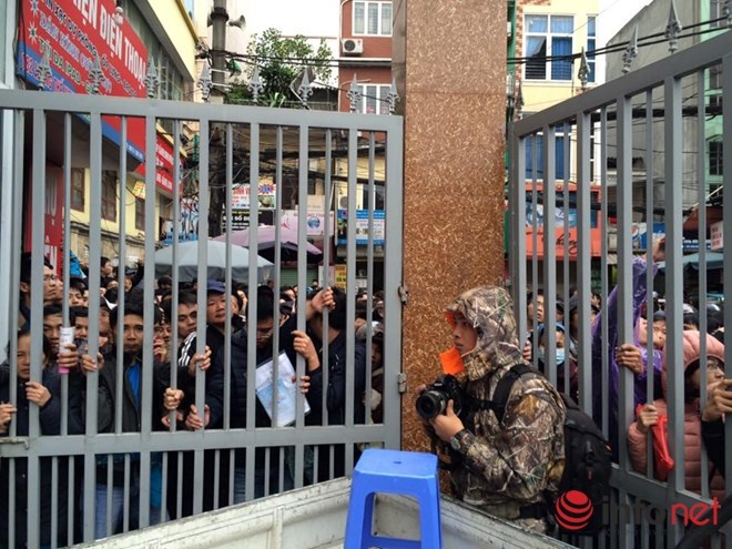 | Cả dòng người chen nhau. Những người hàng đầu phải gồng mình, chống tay vào cửa để chống lại sức ép từ phía sau. |