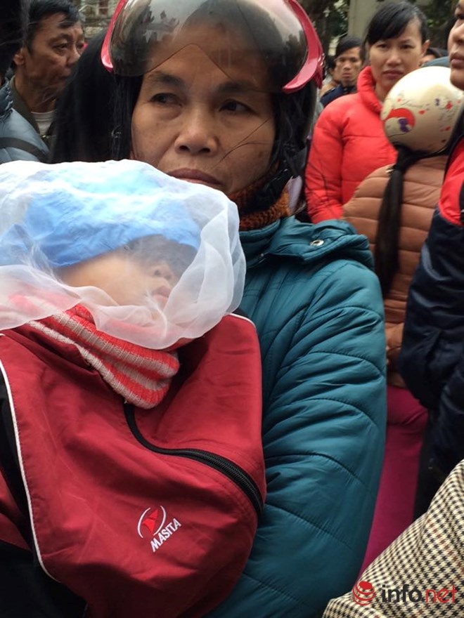 | 6h, chị Nguyễn Thị Cúc từ Thạch Thất đi taxi đến điểm tiêm chủng tại 182 Lương Thế Vinh. Dù nhiều người khuyên đi về chị vẫn quyết định nán lại xếp hàng với hy vọng con được tiêm. |
