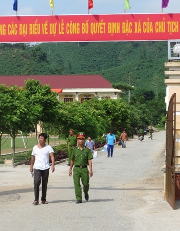 | Tin cùng các phạm nhân được đặc xá vui mừng ra khỏi cổng trại giam. |