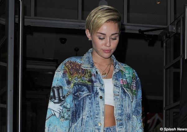 | Chiếc áo khoác jean với họa tiết lạ mắt được Miley kết hợp cùng crop top.