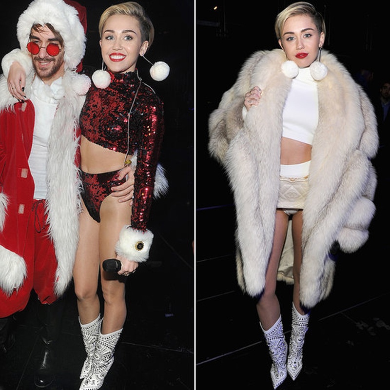 | Miley trong một thiết kế crop top táo bạo đi cùng chiếc áo khoác lông cùng tông màu trắng, đây là sự kết hợp hoàn hảo trên sân khấu.