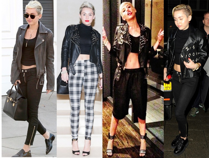 Cô nàng Miley Cyrus cực kỳ yêu thích những chiếc áo khoác da, và chọn đủ kiểu dáng làm trang phục cho mình. Đặc biệt cô cũng kết hợp những chiếc áo khoác này nhiều lần khác nhau cùng crop top.