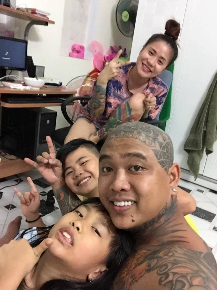 | Huỳnh Kim Hằng và Nguyễn Ngọc Đông Thục cùng sinh năm 1986, hiện sống và làm việc tại TP HCM. Trong giới xăm tại Sài Gòn cũng như trên mạng xã hội, cặp đôi gây chú ý với các họa tiết lớn khắp cơ thể. Vợ chồng xăm trổ đã có hai con là Nguyễn Huỳnh Gia Khang (10 tuổi) và Nguyễn Huỳnh Thục Uyên (6 tuổi). |