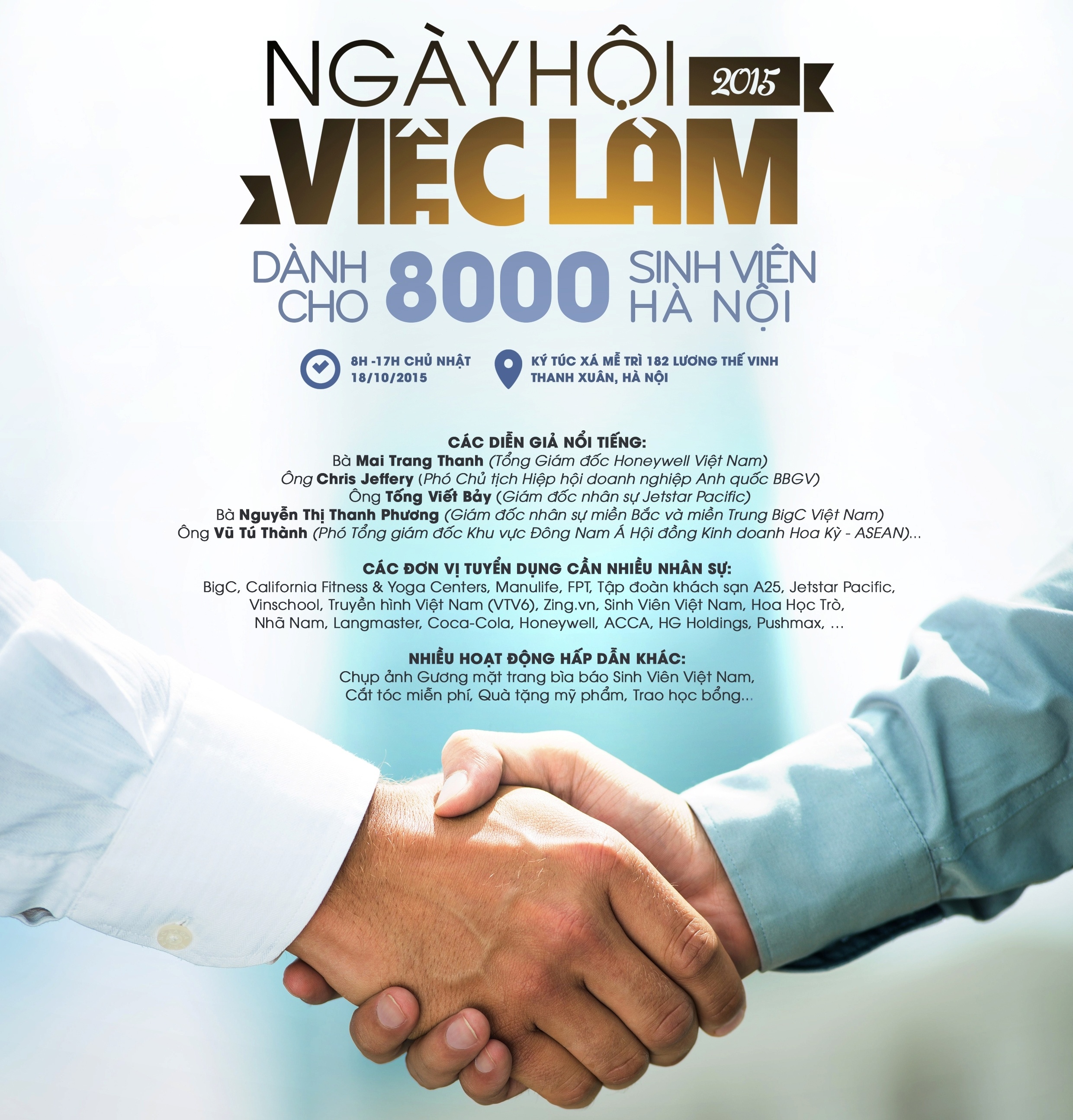 Ngoài ra, các thương hiệu uy tín khác cũng sẽ tuyển nhiều nhân sự trong Ngày hội việc làm 2015 là: VTV6, Báo Sinh Viên Việt Nam, Báo Hoa Học Trò, Zing.vn, Manulife, HG Holdings, KMA, Tập đoàn khách sạn A25, Alsimexco, Pushmax,…